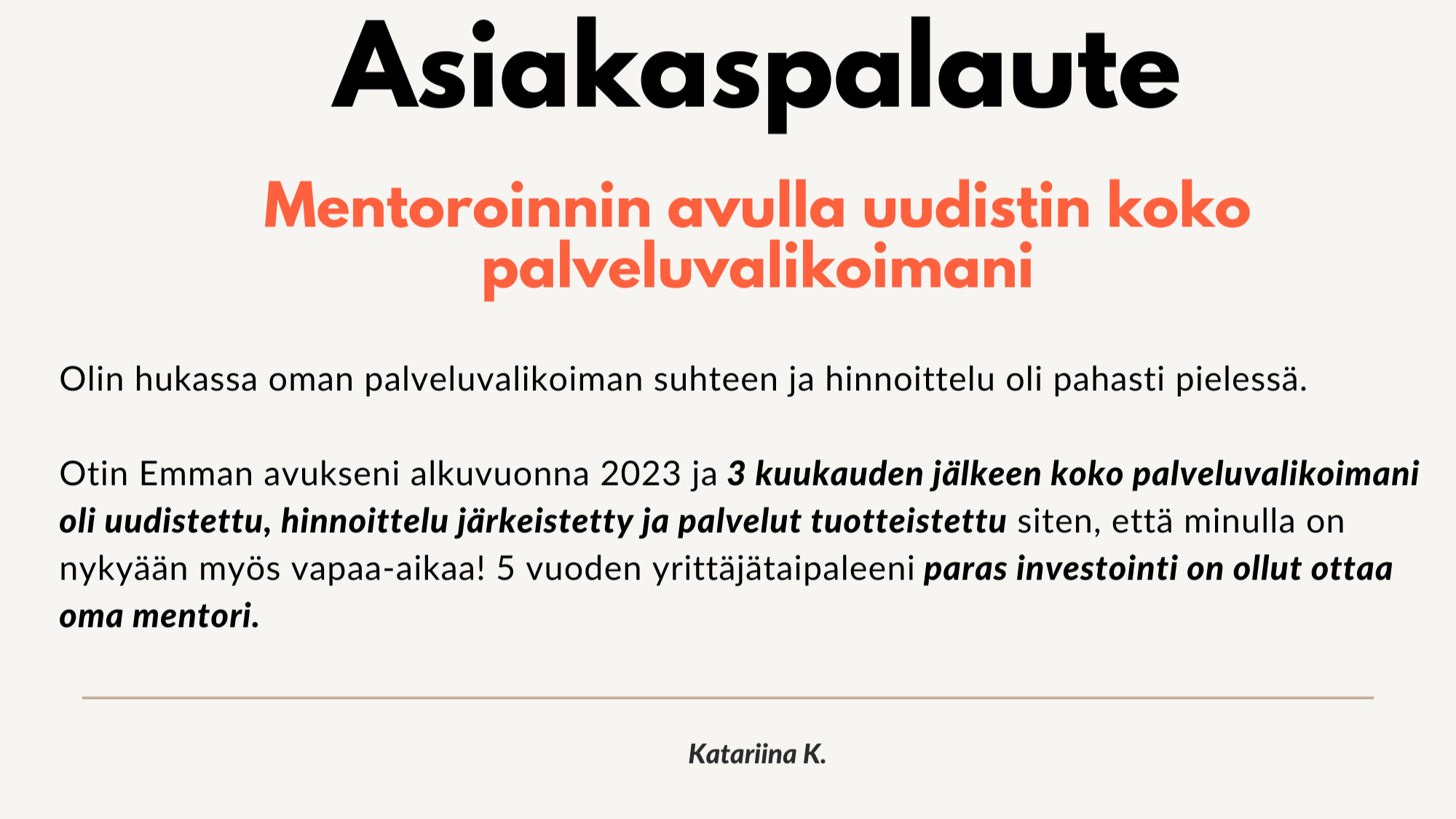 Suosittelen Emmaa lämpimästi asiantuntija-yrittäjälle, joka tarvitsee konkreettista apua yrityksensä eteenpäin viemiseen ja ajankäytön tehostamiseen!"